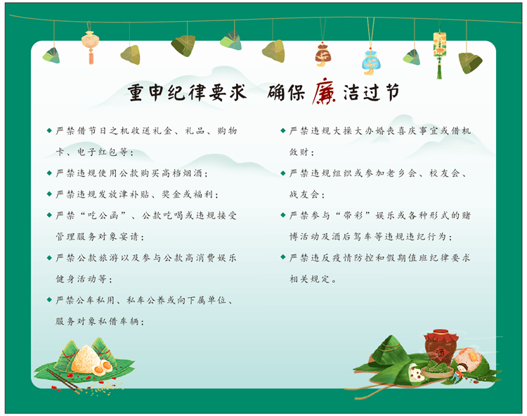 定制廉洁提醒卡。端午廉洁提醒卡内容经过精选,融合廉洁提醒、“十个严禁”、端午诗词鉴赏等内容,在品味端午文化的同时,为全体党员干部职工拧紧纪律“发条”,确保风清气正过端午。