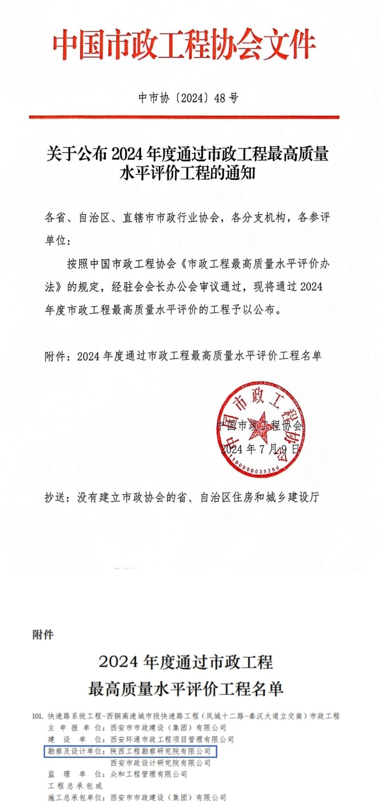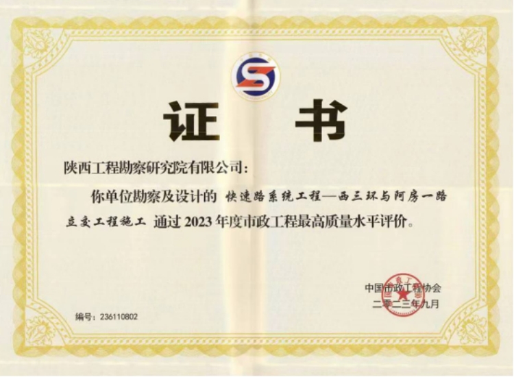 该奖项由中国市政协会组织实施,代表市政工程行业同时期国内先进水平,获奖要求高,评选程序严格,是我国市政行业在工程质量方面的最高荣誉。此前由我公司负责勘察的西三环与阿房一路立交工程施工项目获2023年度市政工程最高质量水平评价,今年西铜高速城市段快速路工程(凤城十二路-秦汉大道立交南)市政工程又获2024年度市政工程最高质量水平评价。连续两年荣获该项“国字”荣誉,充分展示出公司近年来在勘察领域扎实的专业功底及人才培养方面取得的突出成效。